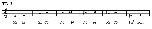 Và như vậy ta có thang âm Fa T với xib, và nếu tiếp tục ta sẽ có Xib T với xib mib, Mib T với xib mib lab, Lab T với xib mib lab rêb, Rêb T với xib mib lab rêb, Xonb T với xib mib lab rêb xonb đôb.